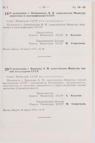 Постановление Совета Министров СССР. О назначении т. Овчинникова Ф.Я. заместителем Министра энергетики и электрификации СССР. 13 января 1978 г. № 30