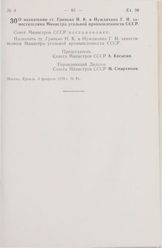 Постановление Совета Министров СССР. О назначении тт. Гринько Н.К. и Нуждихина Г.И. заместителями Министра угольной промышленности СССР. 3 февраля 1978 г. № 81