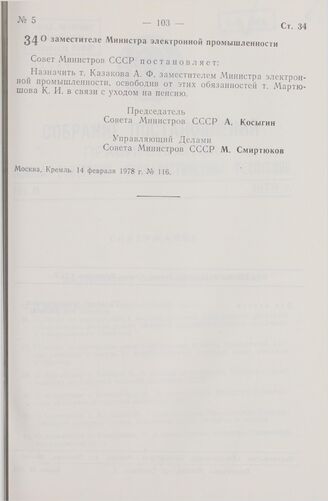 Постановление Совета Министров СССР. О заместителе Министра электронной промышленности. 14 февраля 1978 г. № 116