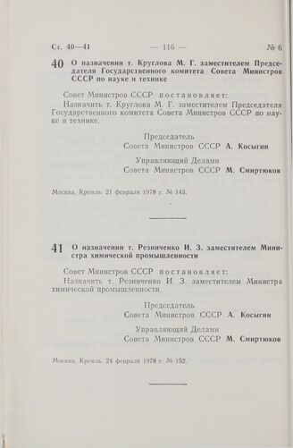 Постановление Совета Министров СССР. О назначении т. Круглова М.Г. заместителем Председателя Государственного комитета Совета Министров СССР по науке и технике. 21 февраля 1978 г. № 143