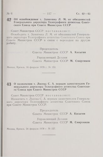 Постановление Совета Министров СССР. О назначении т. Лосева С.А. первым заместителем Генерального директора Телеграфного агентства Советского Союза при Совете Министров СССР. 24 февраля 1978 г. № 157