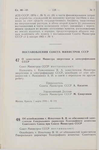 Постановление Совета Министров СССР. О заместителе Министра энергетики и электрификации СССР. 1 марта 1978 г. № 172