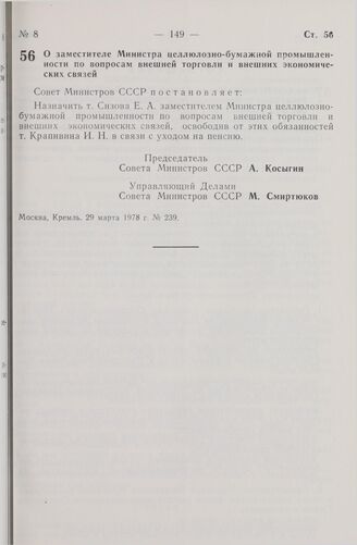 Постановление Совета Министров СССР. О заместителе Министра целлюлозно-бумажной промышленности по вопросам внешней торговли и внешних экономических связей. 29 марта 1978 г. № 239.
