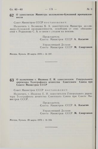 Постановление Совета Министров СССР. О назначении т. Иванова Е.И. заместителем Генерального директора Телеграфного агентства Советского Союза при Совете Министров СССР. 29 марта 1978 г. № 234