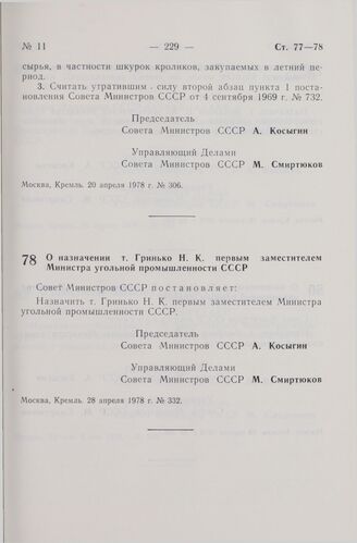 Постановление Совета Министров СССР. О назначении т. Гринько Н.К. первым заместителем Министра угольной промышленности СССР. 28 апреля 1978 г. № 332