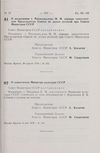 Постановление Совета Министров СССР. О заместителе Министра культуры СССР. 6 мая 1978 г. № 343