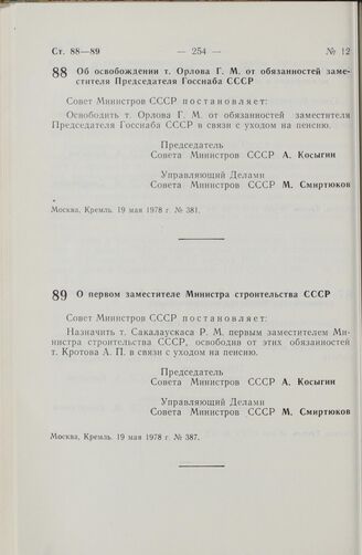 Постановление Совета Министров СССР. Об освобождении т. Орлова Г.М. от обязанностей заместителя Председателя Госснаба СССР. 19 мая 1978 г. № 381