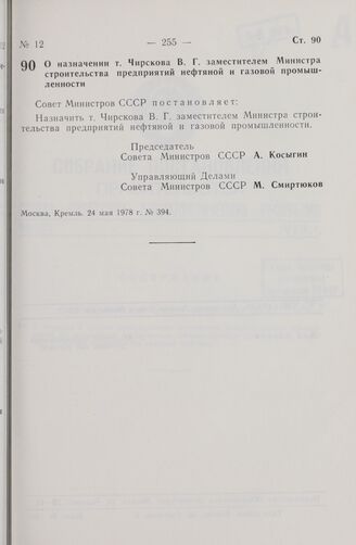 Постановление Совета Министров СССР. О назначении т. Миронова В.Г. заместителем Министра строительства предприятий нефтяной и газовой промышленности. 24 мая 1978 г. № 394