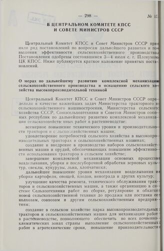 В Центральном Комитете КПСС и Совете Министров СССР. О мерах по дальнейшему развитию комплексной механизации сельскохозяйственного производства и оснащению сельского хозяйства высокопроизводительной техникой. 1978 г.