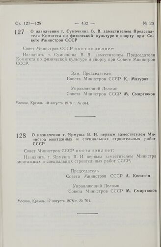 Постановление Совета Министров СССР. О назначении т. Ярмуша В.И. первым заместителем Министра монтажных и специальных строительных работ СССР. 17 августа 1978 г. № 704