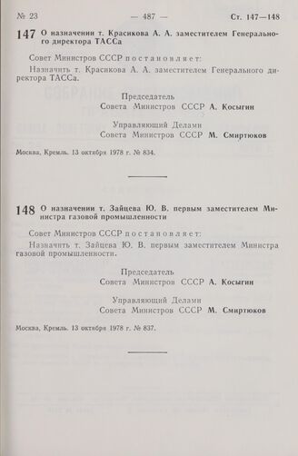 Постановление Совета Министров СССР. О назначении т. Зайцева Ю.В. первым заместителем Министра газовой промышленности. 13 октября 1978 г. № 837