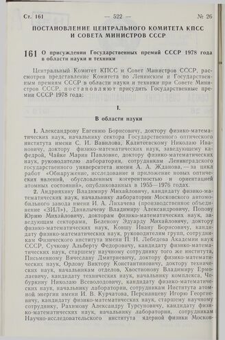 Постановление Центрального Комитета КПСС и Совета Министров СССР. О присуждении Государственных премий СССР 1978 года в области науки и техники. 3 ноября 1978 г. № 899