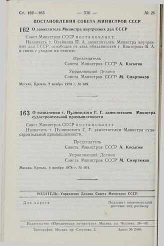 Постановление Совета Министров СССР. О заместителе Министра внутренних дел СССР. 2 ноября 1978 г. № 889