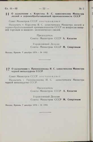 Постановление Совета Министров СССР. О назначении т. Королева В.С. заместителем Министра лесной и деревообрабатывающей промышленности СССР. 7 декабря 1978 г. № 1002