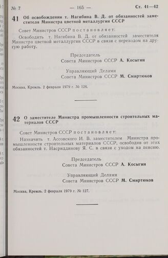 Постановление Совета Министров СССР. Об освобождении т. Нагибина В.Д. от обязанностей заместителя Министра цветной металлургии СССР. 2 февраля 1979 г. № 126