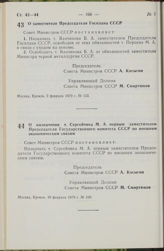 Постановление Совета Министров СССР. О назначении т. Сергейчика М.А. первым заместителем Председателя Государственного комитета СССР по внешним экономическим связям. 10 февраля 1979 г. № 160