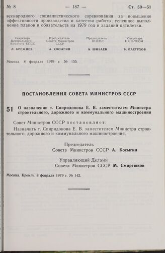 Постановление Совета Министров СССР. О назначении т. Спиридонова Е.В. заместителем Министра строительного, дорожного и коммунального машиностроения. 8 февраля 1979 г. № 142