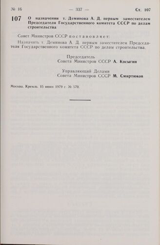 Постановление Совета Министров СССР. О назначении т. Деминова А.Д. первым заместителем Председателя Государственного комитета СССР по делам строительства. 15 июня 1979 г. № 570