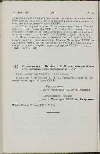 Постановление Совета Министров СССР. О назначении т. Пятибрата В.Л. заместителем Министра промышленного строительства СССР. 27 июня 1979 г. № 615
