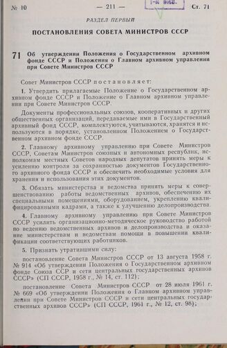 Постановление Совета Министров СССР. Об утверждении Положения о Государственном архивном фонде СССР и Положения о Главном архивном управлении при Совете Министров СССР. 4 апреля 1980 г. № 274