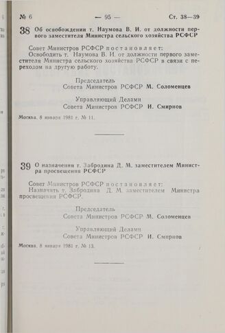 Постановление Совета Министров РСФСР. О назначении т. Забродина Д.М. заместителем Министра просвещения РСФСР. 8 января 1981 г. № 13
