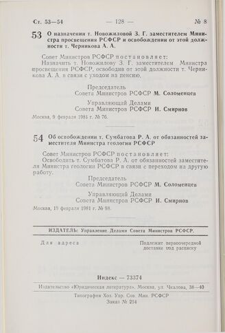 Постановление Совета Министров РСФСР. Об освобождении т. Сумбатова Р.А. от обязанностей заместителя Министра геологии РСФСР. 19 февраля 1981 г. № 98