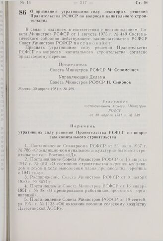 Постановление Совета Министров РСФСР. О признании утратившими силу некоторых решений Правительства РСФСР по вопросам капитального строительства. 30 апреля 1981 г. № 239