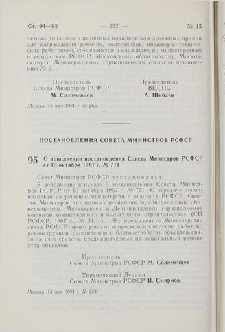 Постановление Совета Министров РСФСР. О дополнении постановления Совета Министров РСФСР от 13 октября 1967 г. № 771. 13 мая 1981 г. № 258