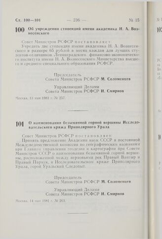Постановление Совета Министров РСФСР. О наименовании безымянной горной вершины Исследовательского кряжа Приполярного Урала. 14 мая 1981 г. № 263