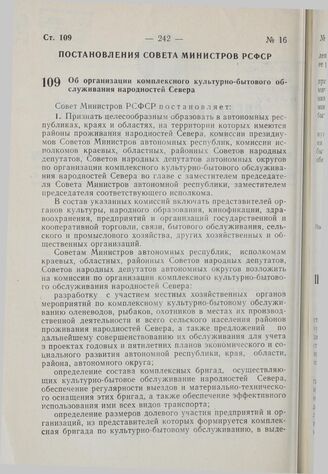 Постановление Совета Министров РСФСР. Об организации комплексного культурно-бытового обслуживания народностей Севера. 26 мая 1981 г. № 276