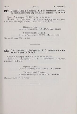 Постановление Совета Министров РСФСР. О назначении т. Бочарова Н.Я. заместителем Министра промышленности строительных материалов РСФСР. 26 июня 1981 г. № 349