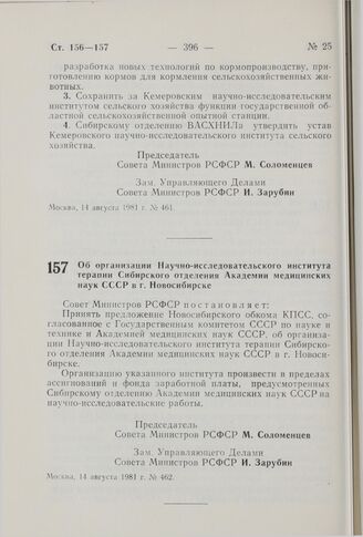 Постановление Совета Министров РСФСР. Об организации Научно-исследовательского института терапии Сибирского отделения Академии медицинских наук СССР в г. Новосибирске. 14 августа 1981 г. № 462