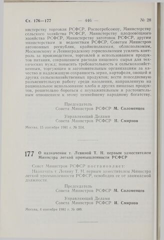 Постановление Совета Министров РСФСР. О назначении т. Левиной Т.Н. первым заместителем Министра легкой промышленности РСФСР. 4 сентября 1981 г. № 489