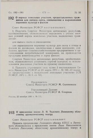 Постановление Совета Министров РСФСР. О присвоении имени Л.Н. Толстого Липецкому областному драматическому театру. 22 октября 1981 г. № 577
