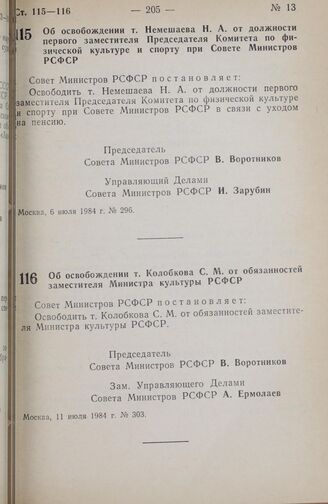Постановление Совета министров РСФСР. Об освобождении т. Немешаева Н. А. от должности первого заместителя Председателя Комитета по физической культуре и спорту при Совете Министров РСФСР. 6 июля 1984 г. № 296