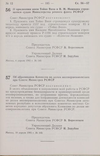 Постановление Совета Министров РСФСР об образовании Комиссии по делам несовершеннолетних при Совете Министров РСФСР. 18 апреля 1985 г. № 163
