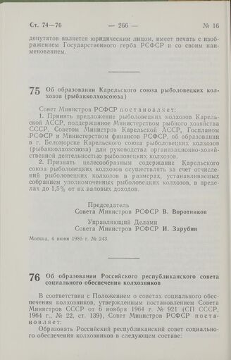Постановление Совета Министров РСФСР об образовании Карельского союза рыболовецких колхозов (рыбакколхозсоюза). 4 июня 1985 г. № 243
