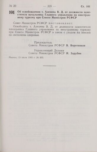 Постановление Совета Министров РСФСР об освобождении т. Алехина В. Д. от должности заместителя начальника Главного управления по иностранному туризму при Совете Министров РСФСР. 15 июля 1985 г. № 305