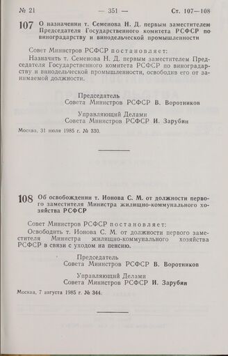 Постановление Совета Министров РСФСР о назначении т. Семенова Н. Д. первым заместителем Председателя Государственного комитета РСФСР по виноградарству и винодельческой промышленности. 31 июля 1985 г. № 330