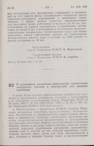 Постановление Совета Министров РСФСР о дальнейшем увеличении производства строительных материалов, изделий и конструкций для продажи населению. 31 июля 1985 г. № 335