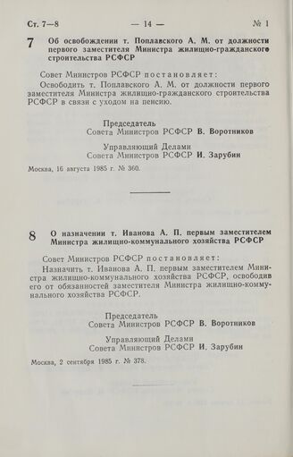 Постановление Совета Министров РСФСР. О назначении т. Иванова А. П. первым заместителем Министра жилищно-коммунального хозяйства РСФСР. 2 сентября 1985 г. № 378