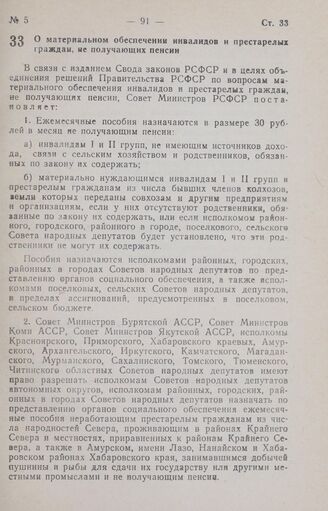 Постановление Совета Министров РСФСР. О материальном обеспечении инвалидов и престарелых граждан, не получающих пенсии. 17 октября 1985 г. № 456