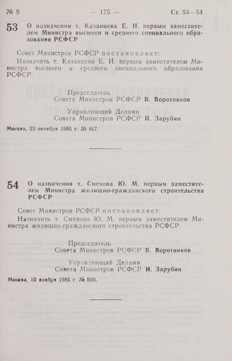 Постановление Совета Министров РСФСР. О назначении т. Смехова Ю. М. первым заместителем Министра жилищно-гражданского строительства РСФСР. 10 ноября 1985 г. № 500