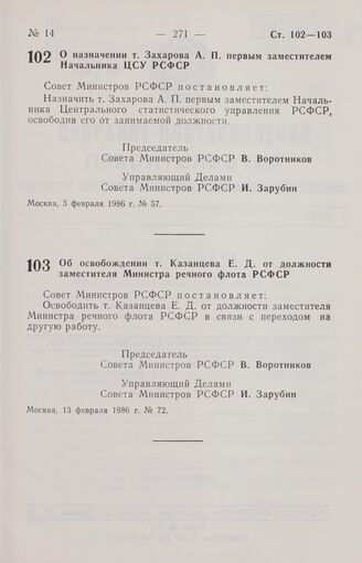 Постановление Совета Министров РСФСР. Об освобождении т. Казанцева Е. Д. от должности заместителя Министра речного флота РСФСР. 13 февраля 1986 г. № 72