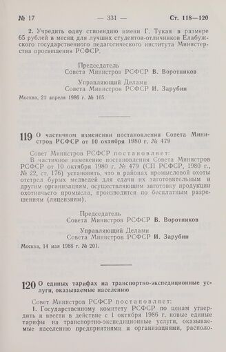 Постановление Совета Министров РСФСР. О частичном изменении постановления Совета Министров РСФСР от 10 октября 1980 г. № 479. 14 мая 1986 г. № 201