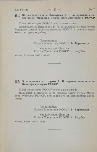 Постановление Совета Министров РСФСР. Об освобождении т. Выскубова В. П. от должности заместителя Министра легкой промышленности РСФСР. 23 апреля 1987 г. № 166