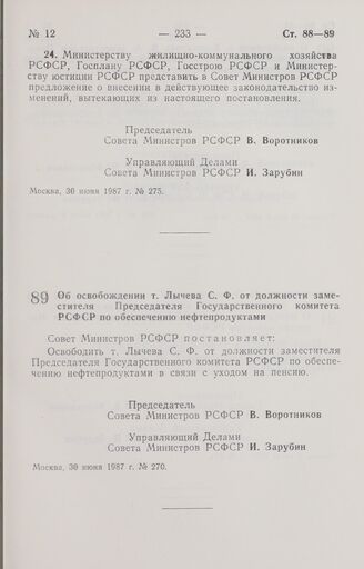 Постановление Совета Министров РСФСР. Об освобождении т. Лычева С. Ф. от должности заместителя Председателя Государственного комитета РСФСР по обеспечению нефтепродуктами. 30 июня 1987 г. № 270