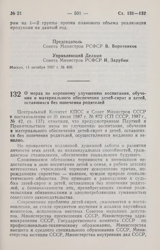 Постановление Совета Министров РСФСР. О мерах по коренному улучшению воспитания, обучения и материального обеспечения детей-сирот и детей, оставшихся без попечения родителей. 14 октября 1987 г. № 401
