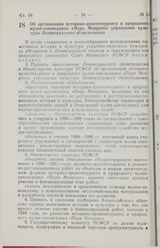 Постановление Совета Министров РСФСР. Об организации историко-архитектурного и природного музея-заповедника «Парк Монрепо» управления культуры Ленинградского облисполкома. 22 января 1988 г. № 30