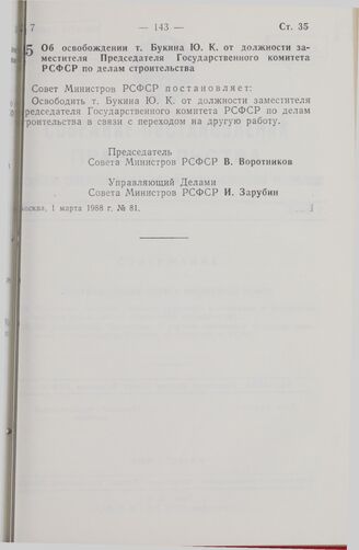 Постановление Совета Министров РСФСР. Об освобождении т. Букина Ю. К. от должности заместителя Председателя Государственного комитета РСФСР по делам строительства. 1 марта 1988 г. № 81